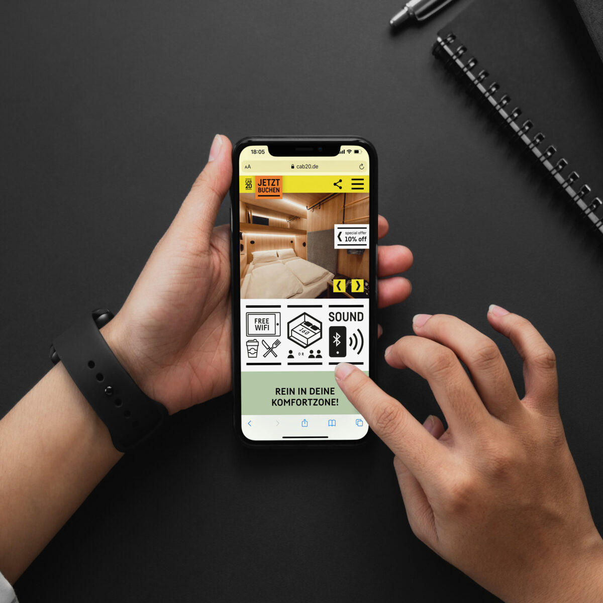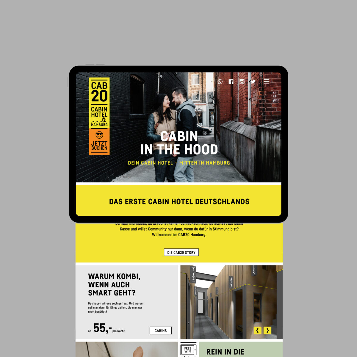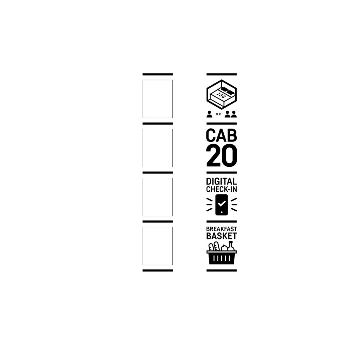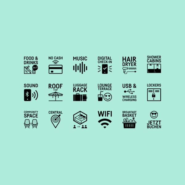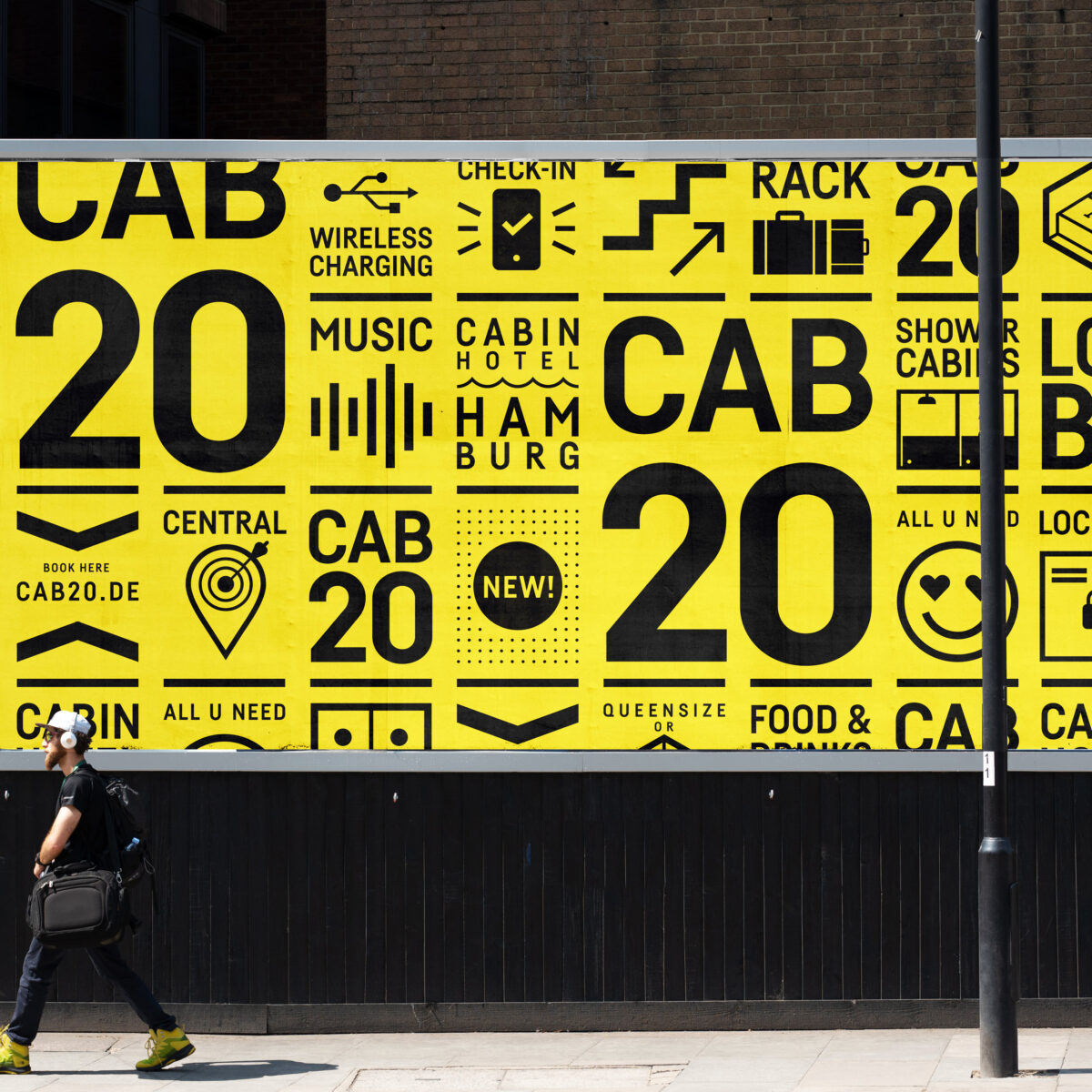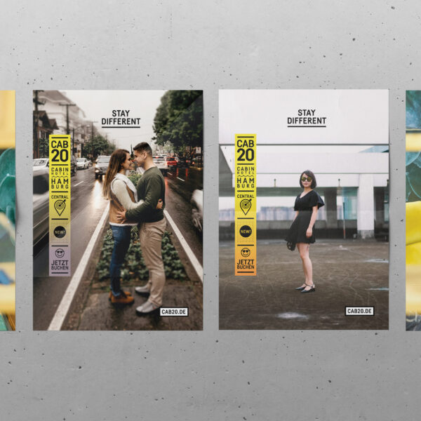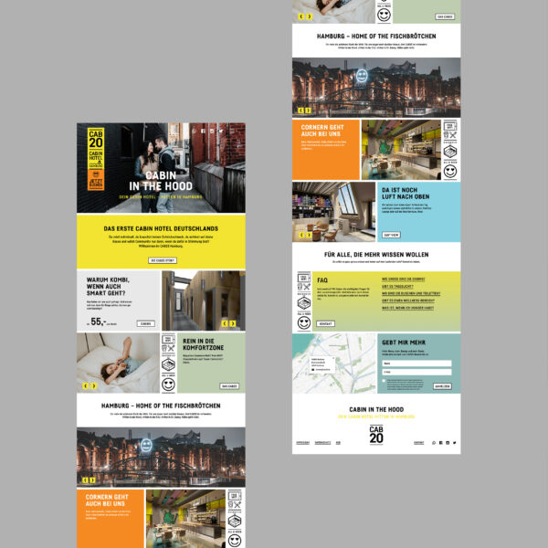 Your cabin in the hood. Willkommen im CAB 20, Deutschlands erstem Cabin Hotel, mitten in der Hamburger City! Maximaler Komfort auf minimalem Raum. In jede Cabin passt genau ein Queensize Doppelbett. Aus dieser Proportion haben wir ein Grid entwickelt, das als Basis für Icons, Infos und das gesamte Corporate Design dient. Inspiriert von der vertikalen Schreibweise japanischer Neonschilder verdeutlich der modulare Look die Vielfältigkeit und Individualität dieser Location.