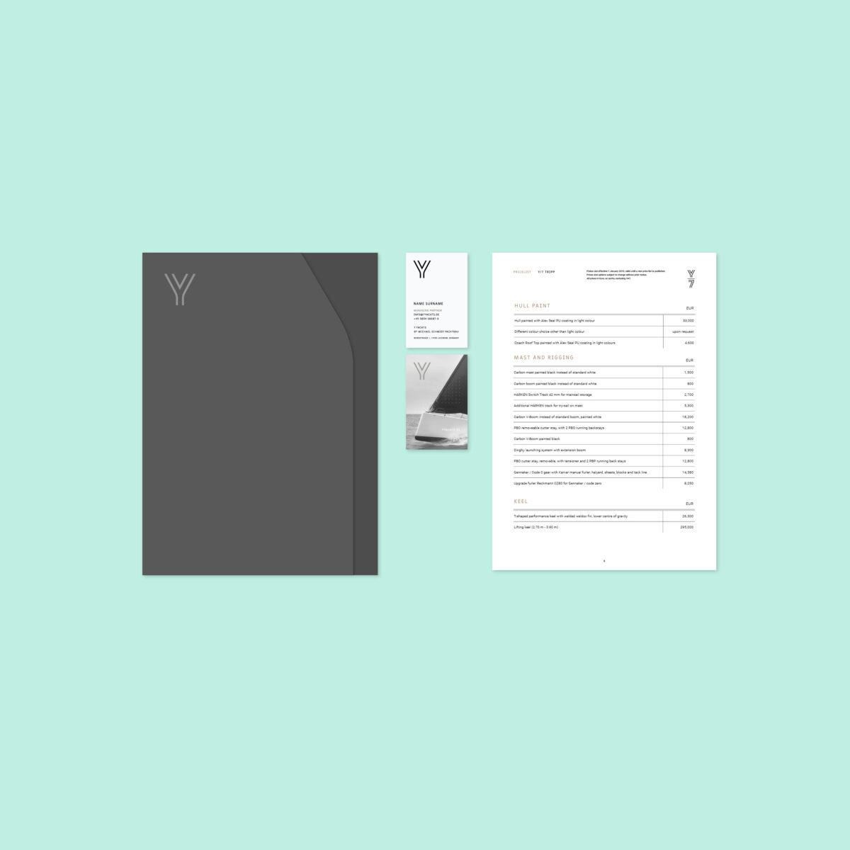 Die Gründung von YYachts ist eine der vielen Erfolgsgeschichten des erfahrenen Segel-Pioniers und Bootsbauers Michael Schmidt. Das Konzept liegt in der Verbindung von innovativem Karbon-Leichtbau und einfachem Handling mit smartem Luxus und moderner Eleganz. Das macht die Segelboote schnell und sporttauglich – gleichzeitig bieten sie den Luxus eleganter Reiseyachten. Format Design entwickelte den gesamten Auftritt der Marke, von der Mitwirkung beim Strategie- und Naming-Prozess über die Entwicklung des Corporate Designs und der Produktmarken-Architektur bis hin zur Gestaltung der umfassenden Image- und Verkaufsliteratur.